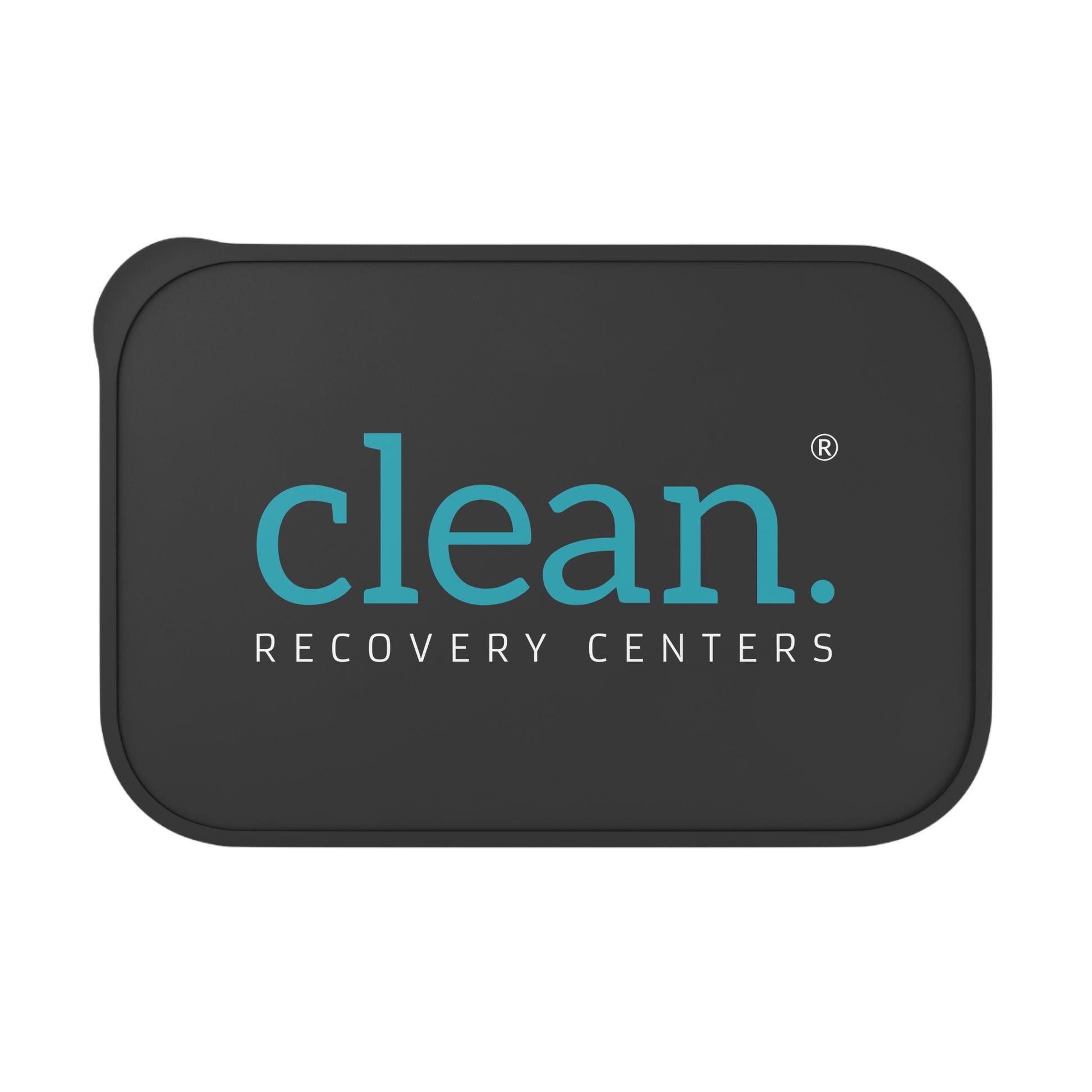 An eco-friendly solution to bringing your lunch to work! The matte black container, made plant-based bioplastic, features a crisp, full-coverage Clean Recovery Centers logo on the lid and a subtle stipple texture for grip.