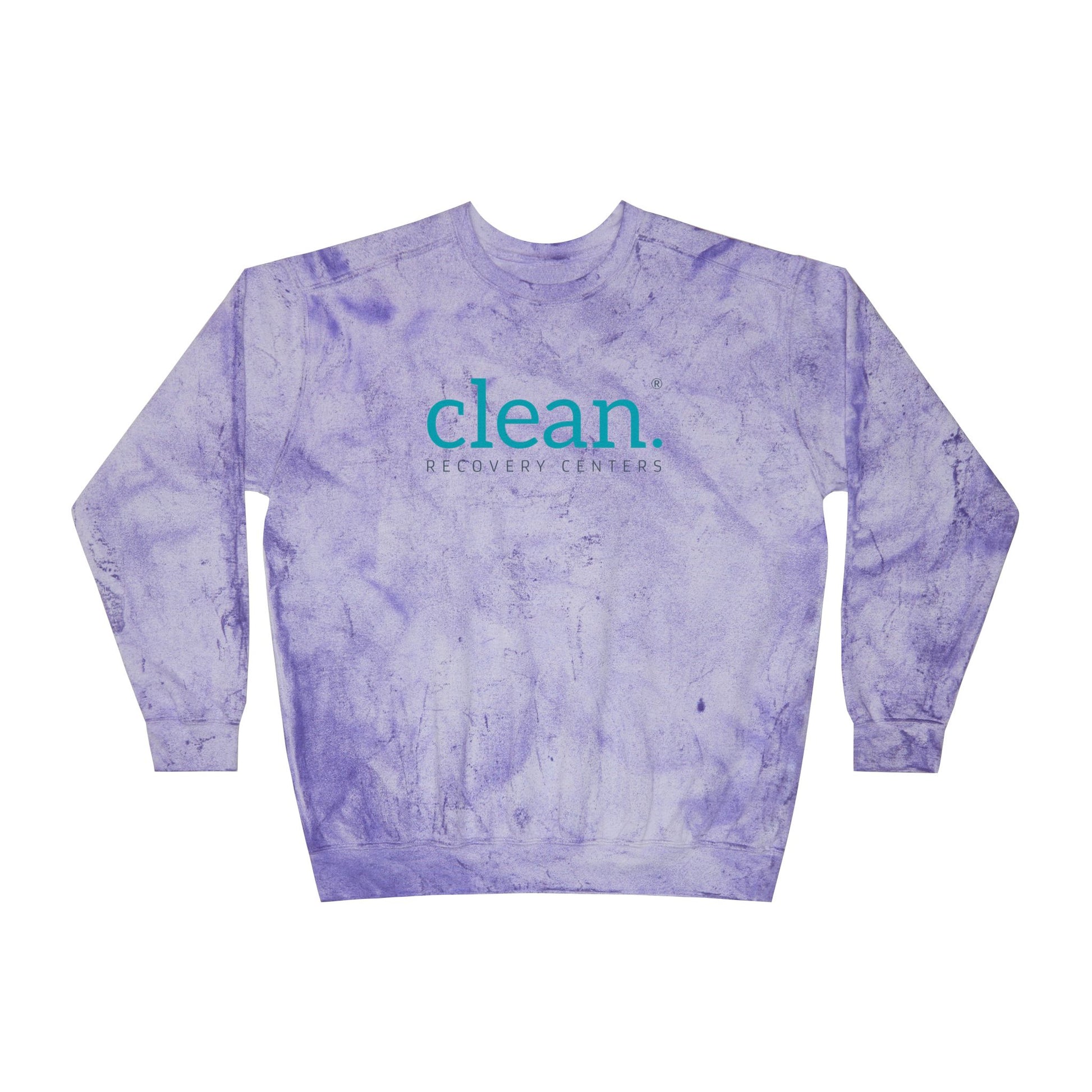 A soft garment-dyed crewneck with a dreamy Ocean or Amethyst marble tie-dye pattern, featuring the minimalist Clean Recovery Centers logo across the chest.