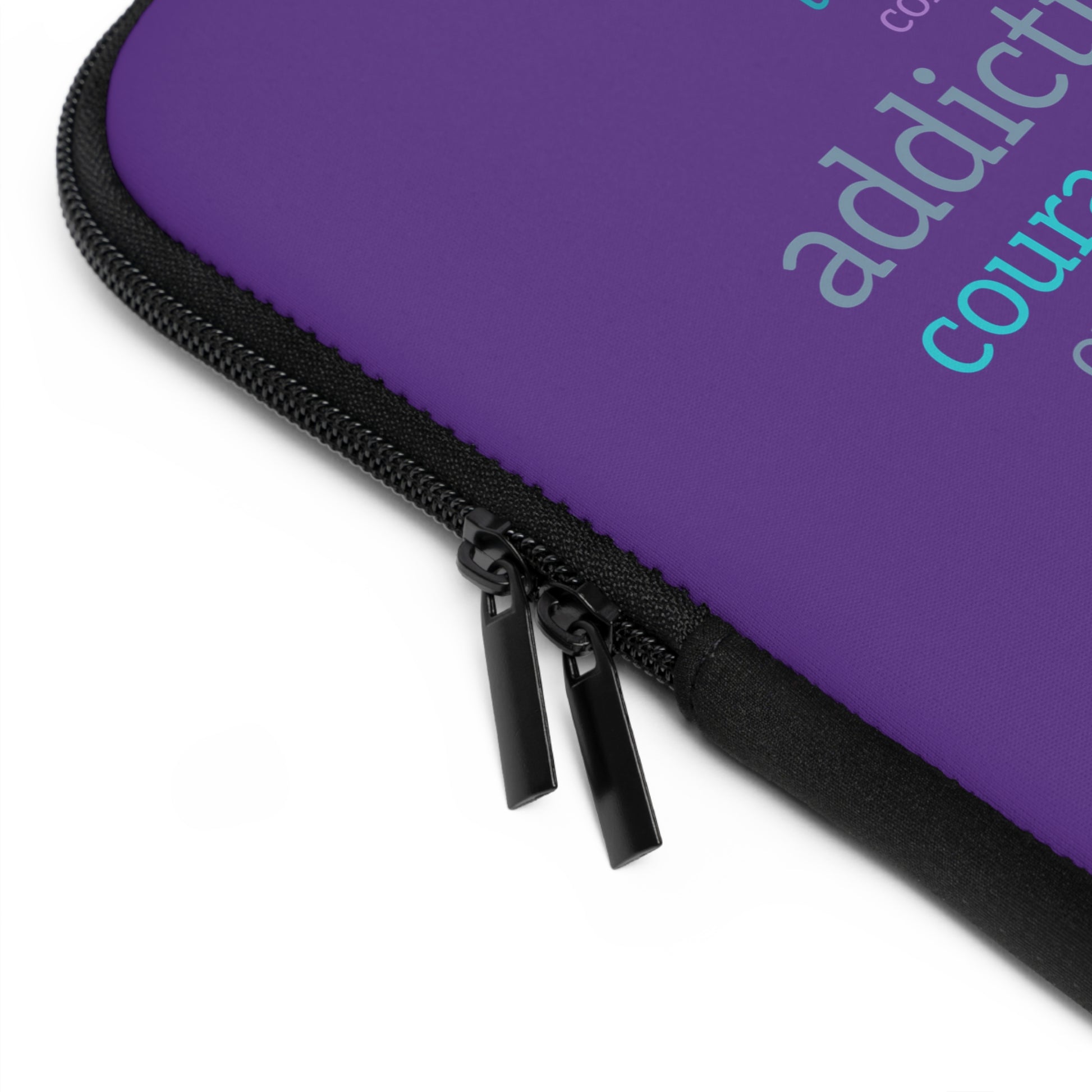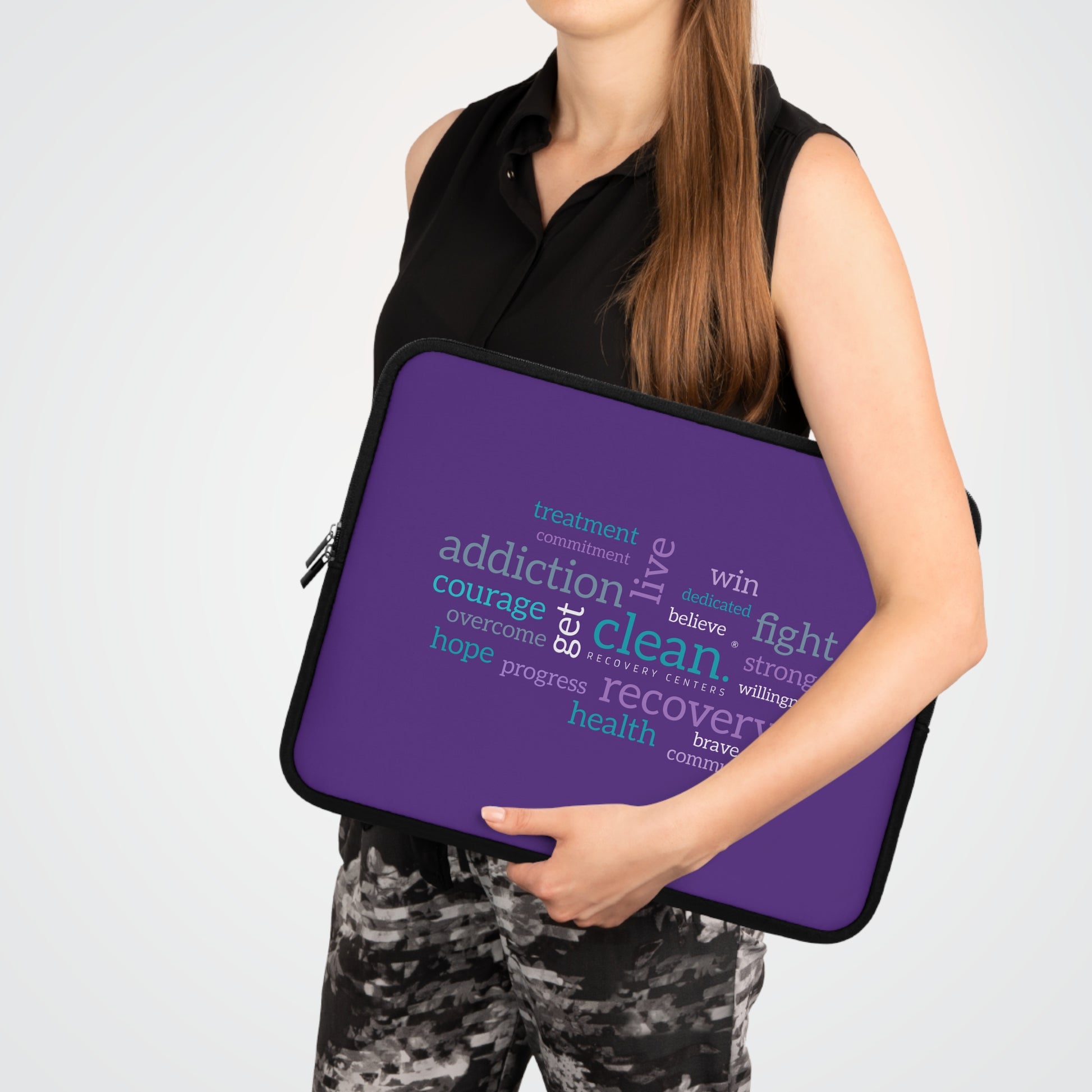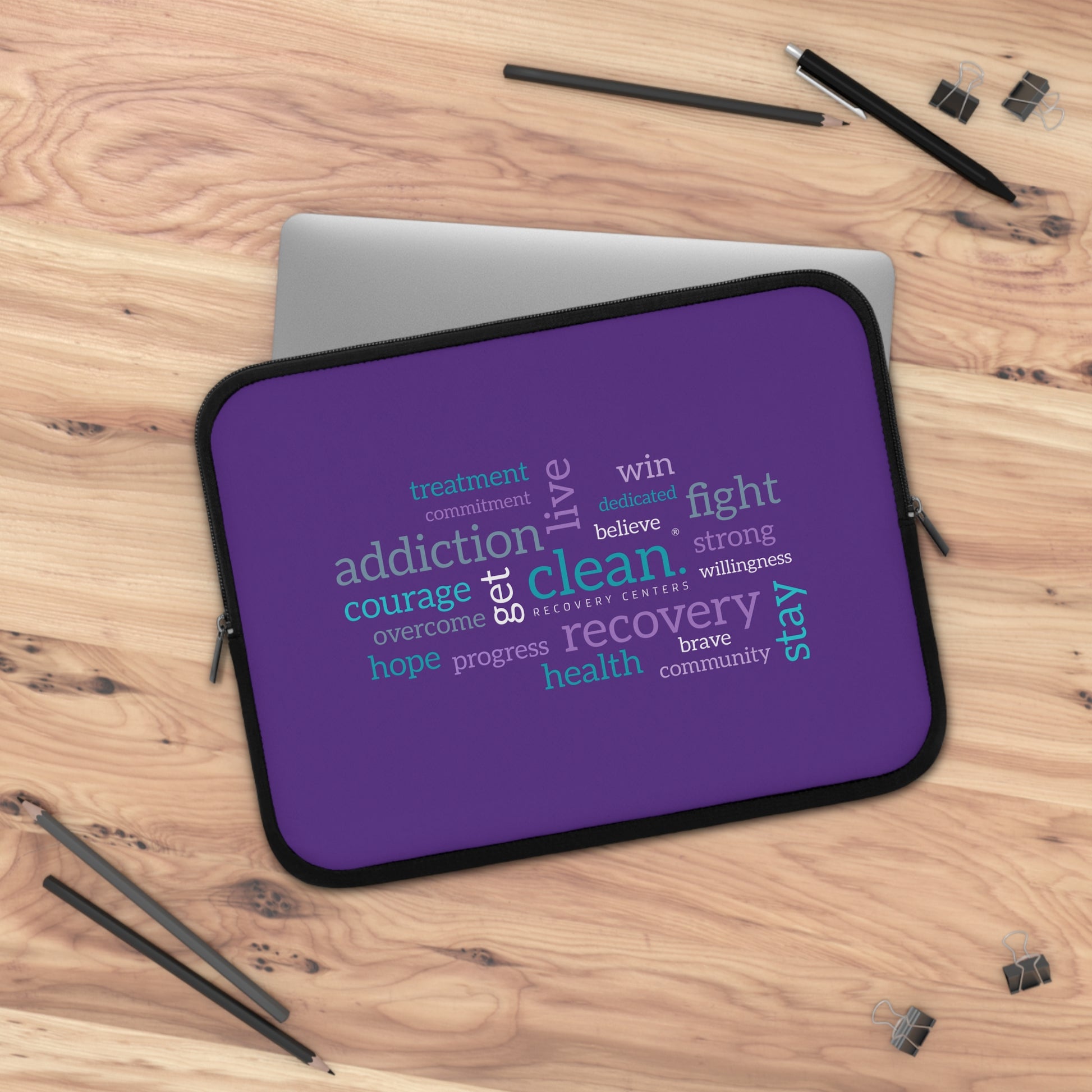 The Clean Word Cloud laptop sleeve carries a quiet, determined energy. A purple field holds a cluster of hopeful words—brave, recovery, commitment, courage, hope—arranged like a compact mantra, surrounding the Clean Recovery Centers logo. Use it on the way to meetings, meetings with a counselor, support-group nights, or wherever you need a small, steady reminder of progress and purpose.