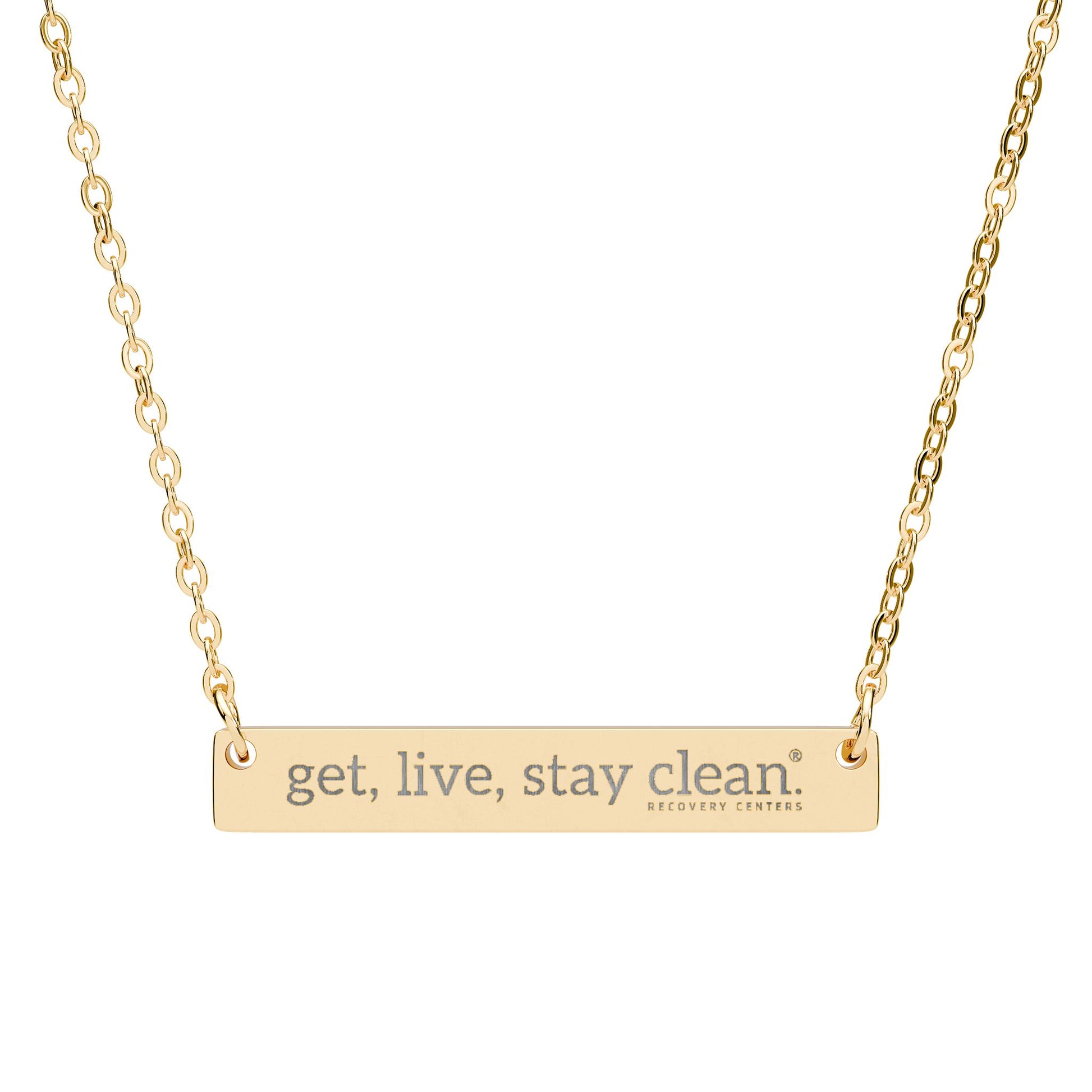 This engraved horizontal bar necklace features a sleek, minimalist pendant engraved with a reminder to get, live and stay clean. Crafted for everyday wear, it layers beautifully or shines on its own—making it a thoughtful gift or timeless keepsake you’ll reach for again and again.