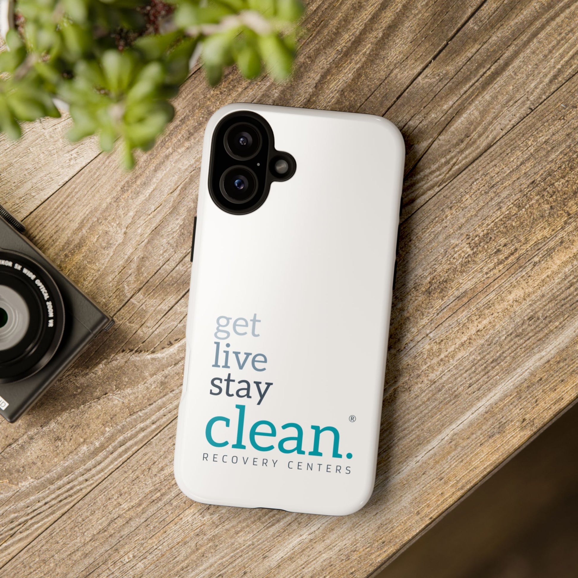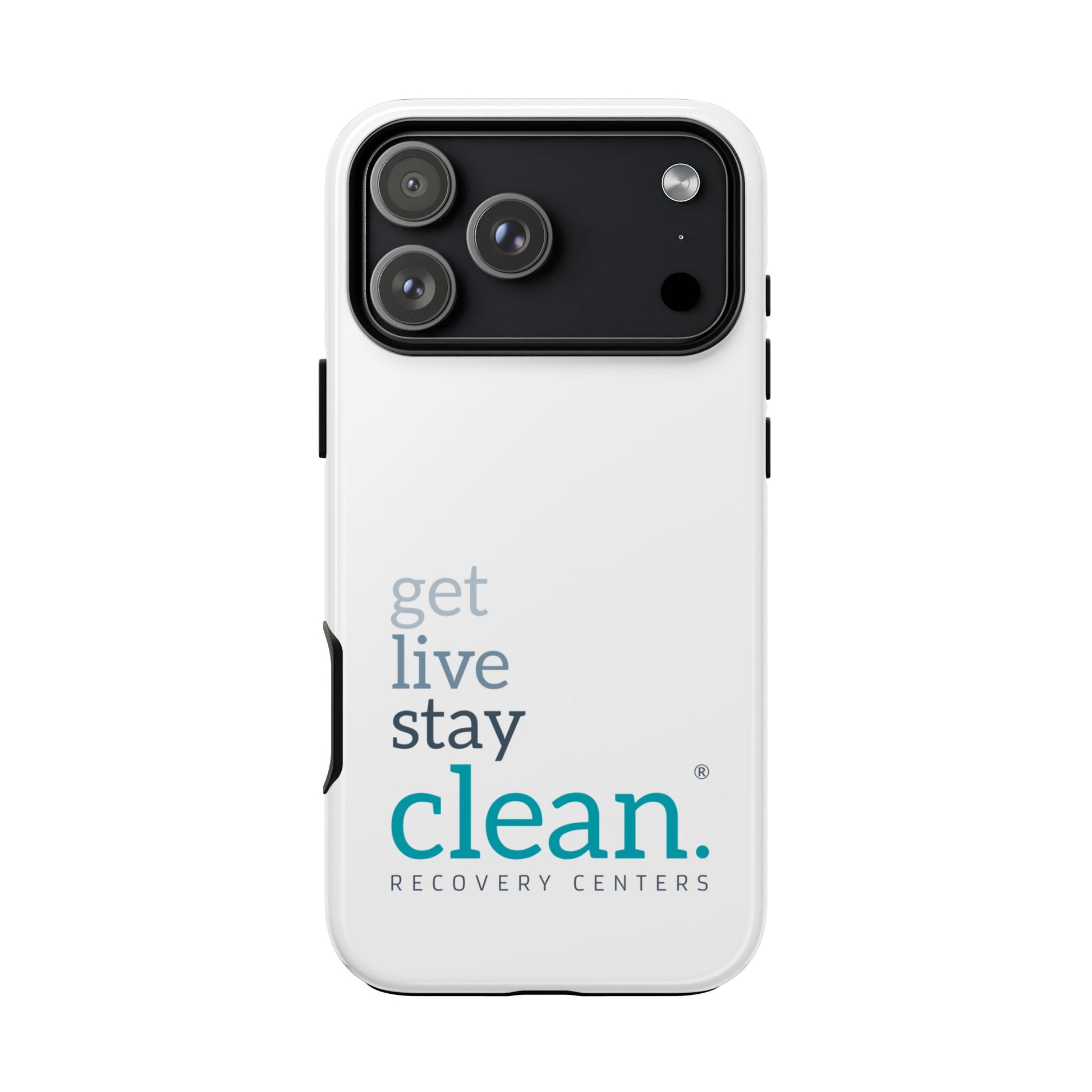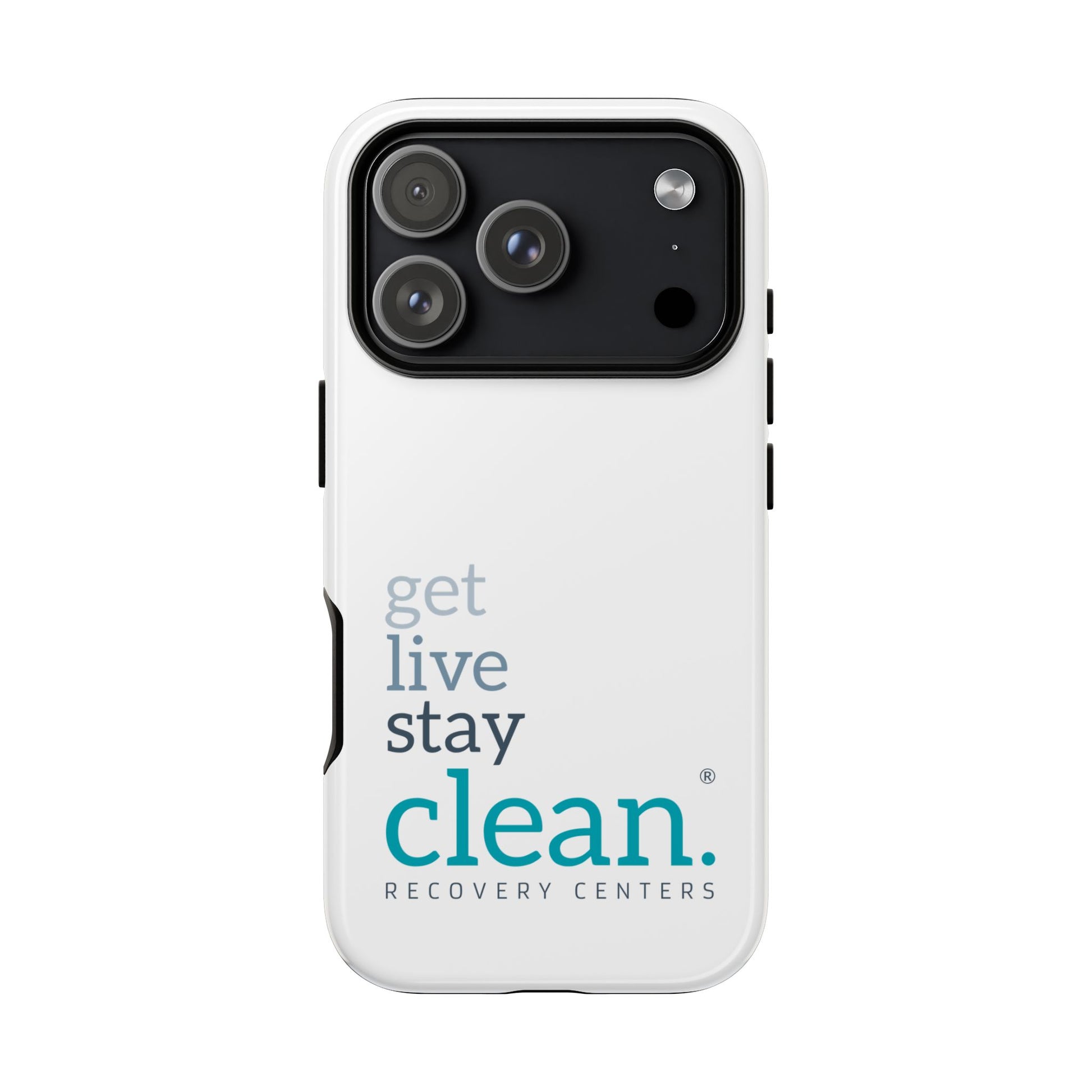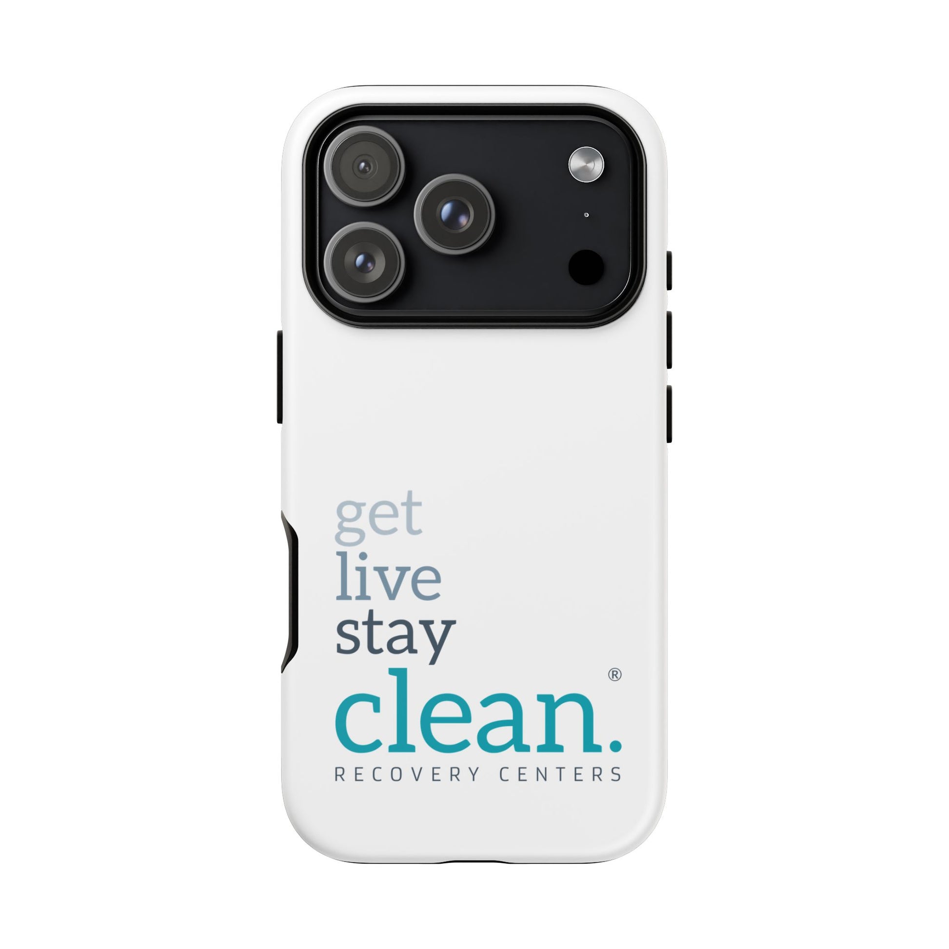 Clean Recovery Centers "Get, Live, Stay" logo printed in teal and grey on lower back side of white phone case.