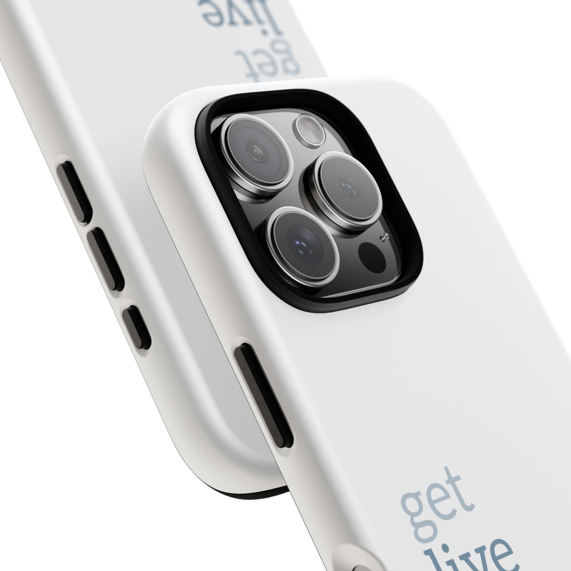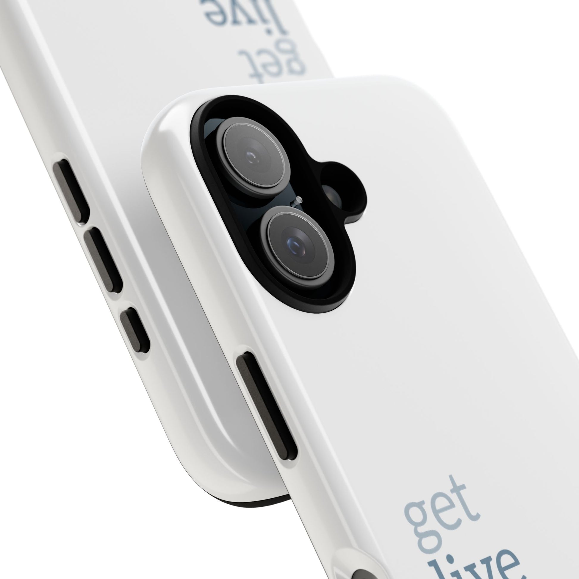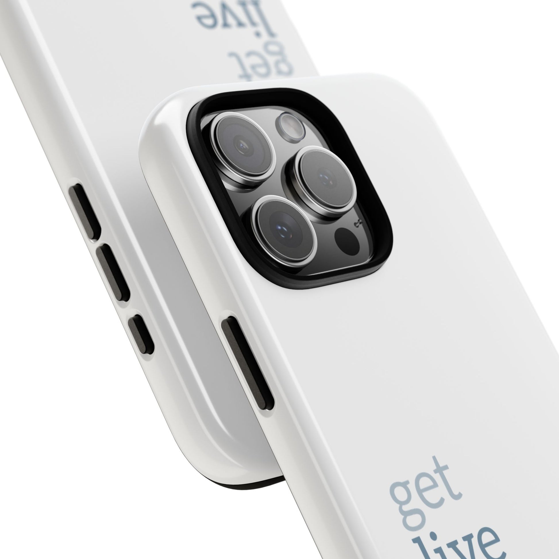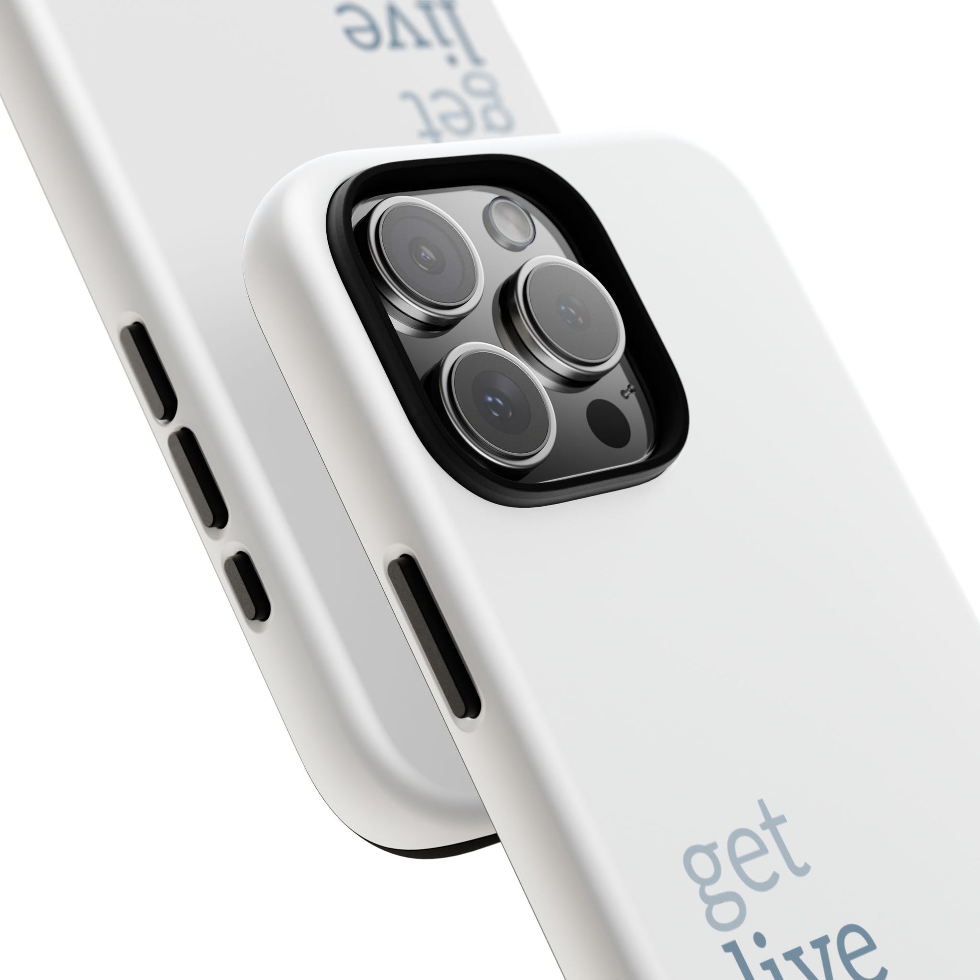 Clean Recovery Centers "Get, Live, Stay" logo printed in teal and grey on lower back side of white phone case.