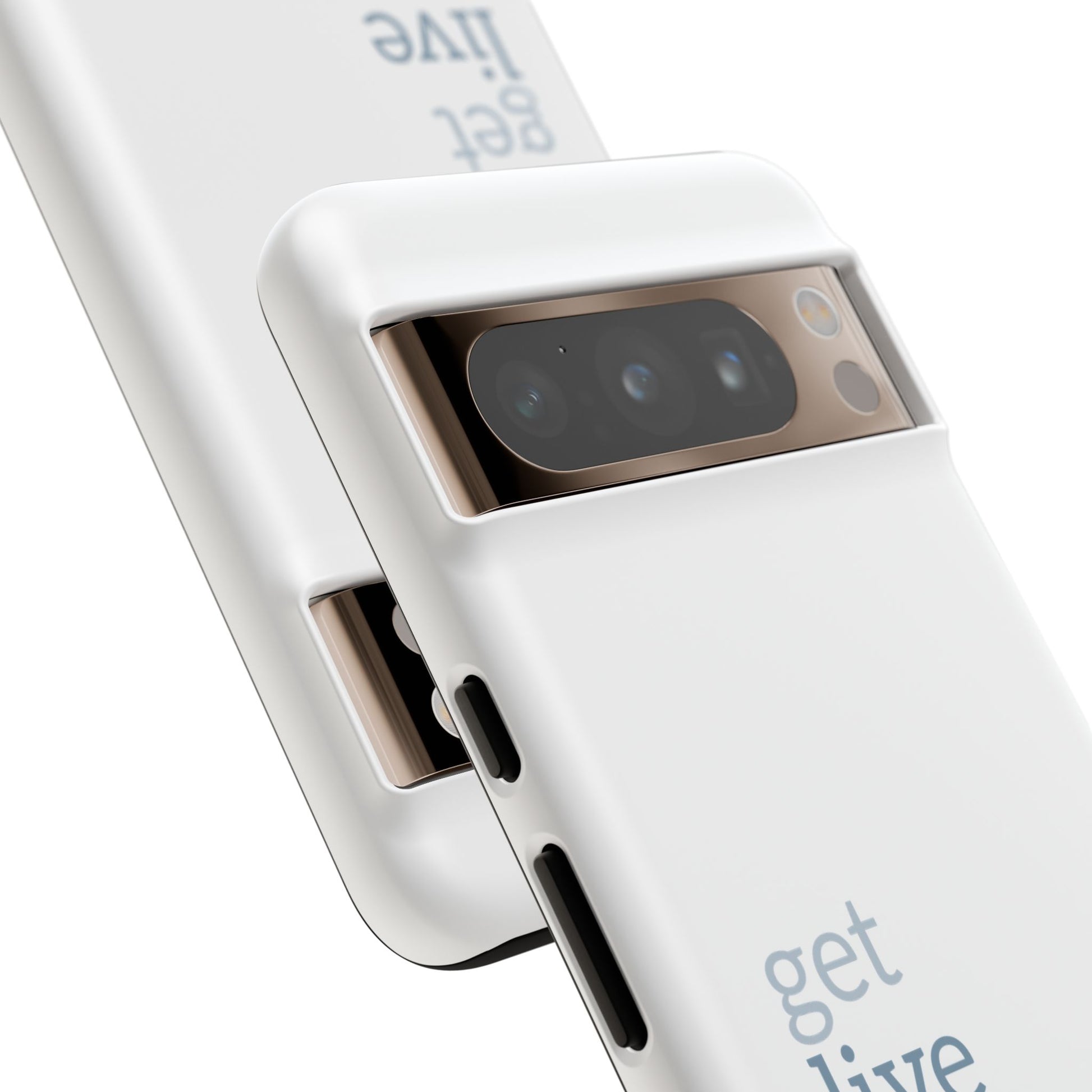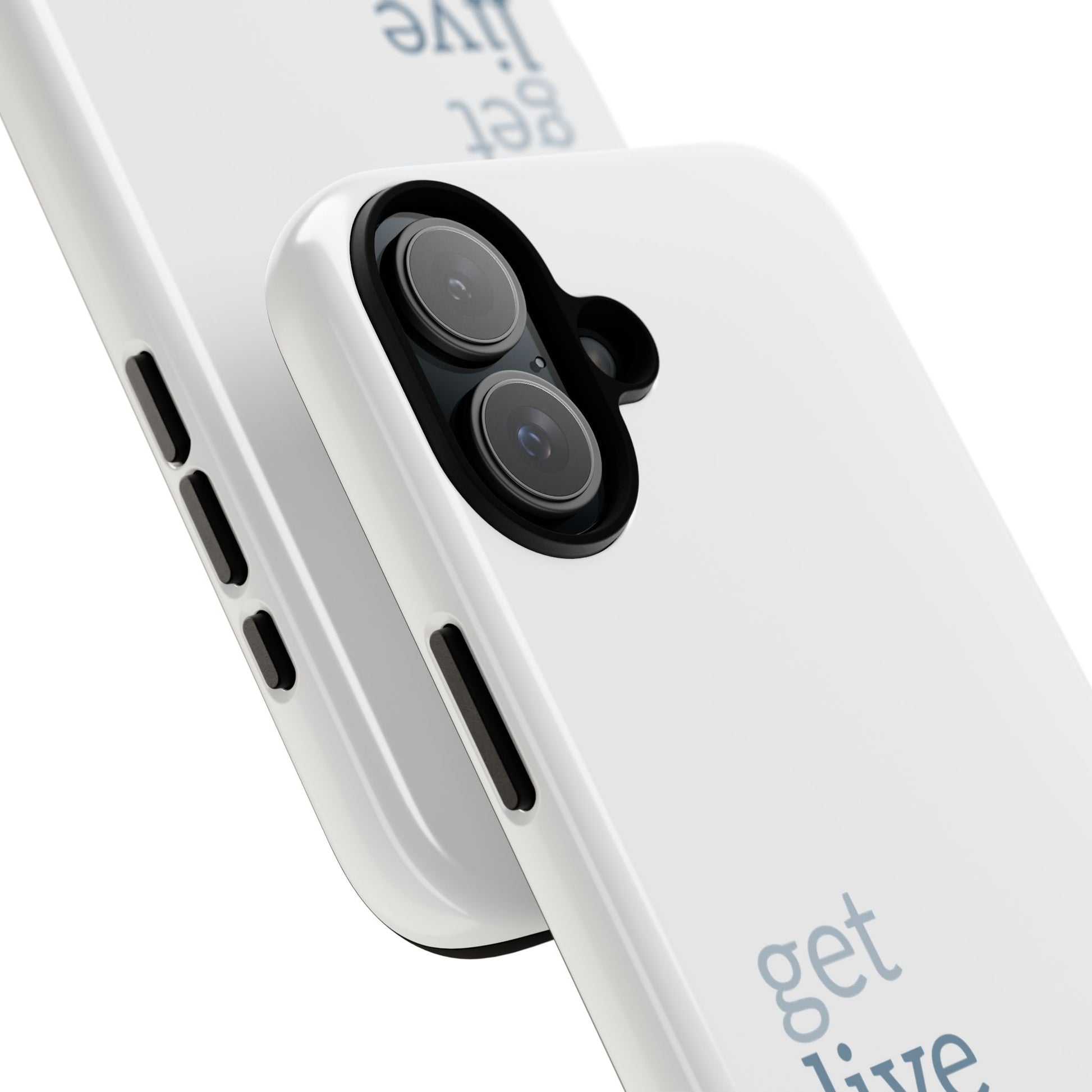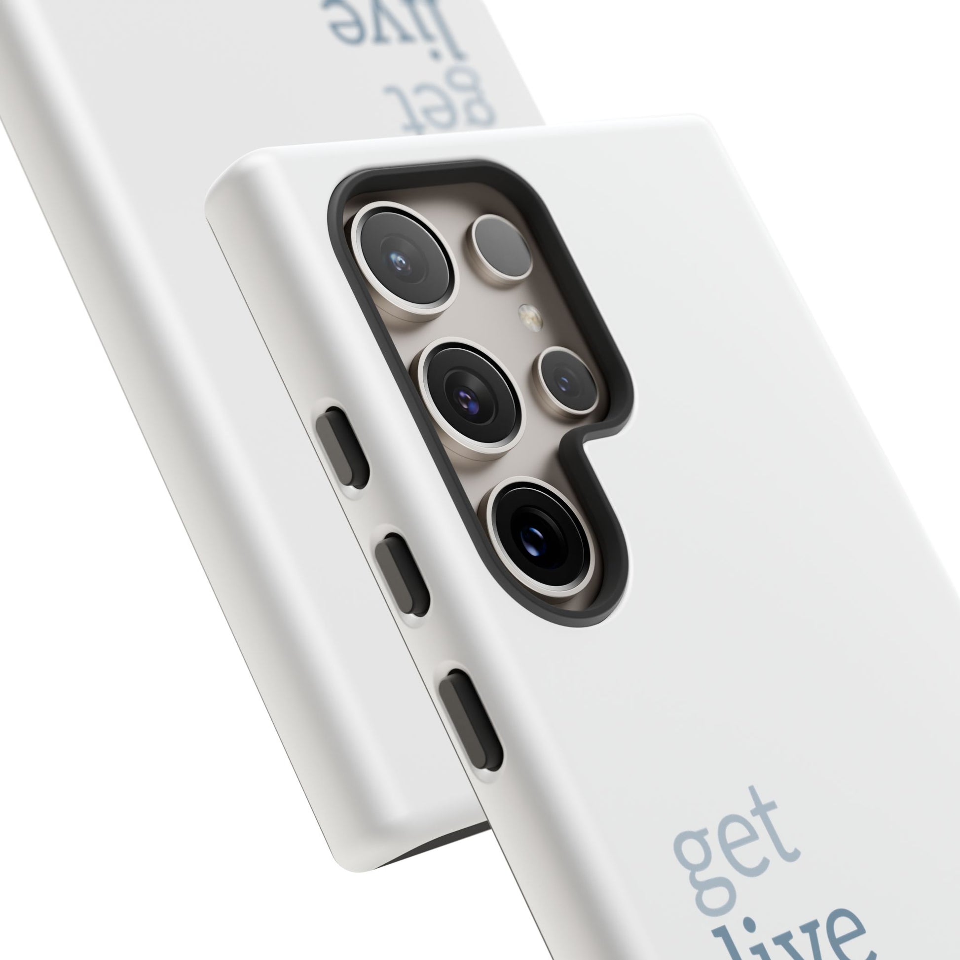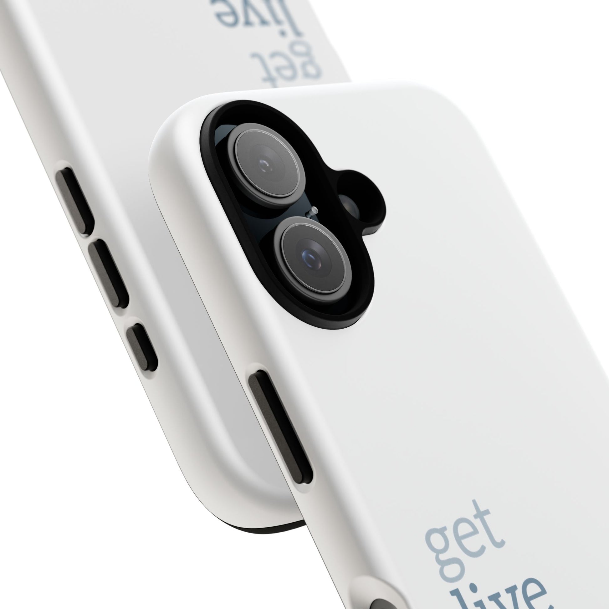 Clean Recovery Centers "Get, Live, Stay" logo printed in teal and grey on lower back side of white phone case.